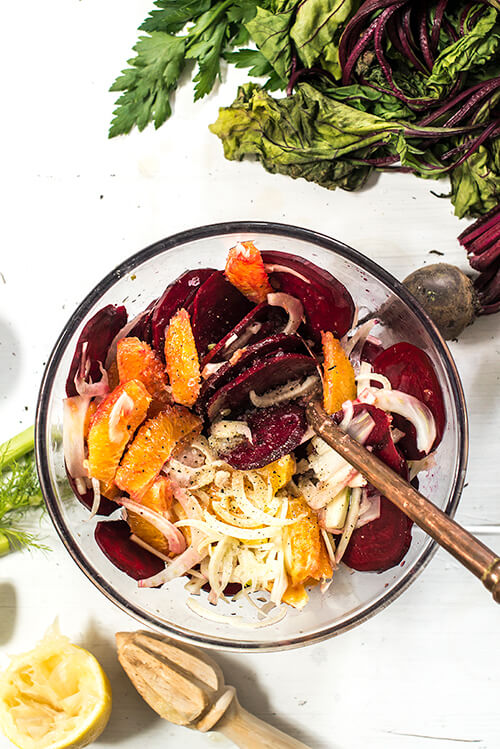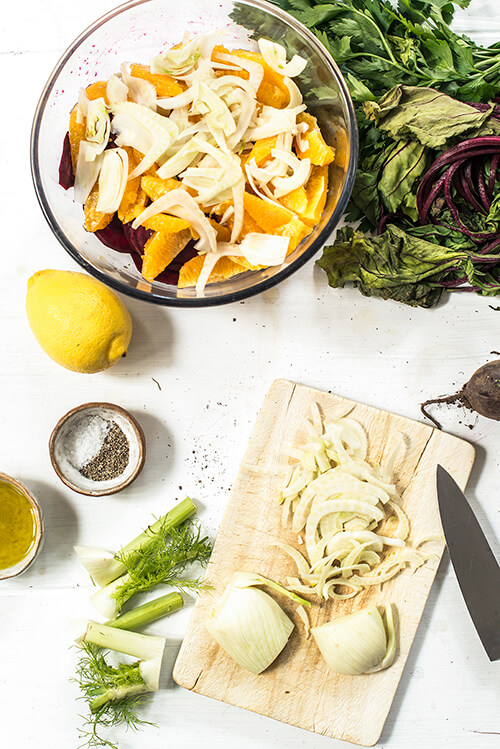 One of the many beautiful things about summer is the abundance of fresh produce and the lack of a need to cook hot meals. When the temperatures rise, we usually feel less inclined to reach for comfort food and are instead quite happy to munch on fresh salads. That doesn’t mean just chucking some lettuce leaves in a bowl though. It means we can get creative with all sorts of vegetables that don’t necessarily need to be cooked. Like beetroots. Their smooth taste, crunchy texture and vibrant colour makes them the perfect vegetable for a salad. Add some punchy flavours in the shape of orange and fennel and you have a great cold dish that will steal the show on any table.