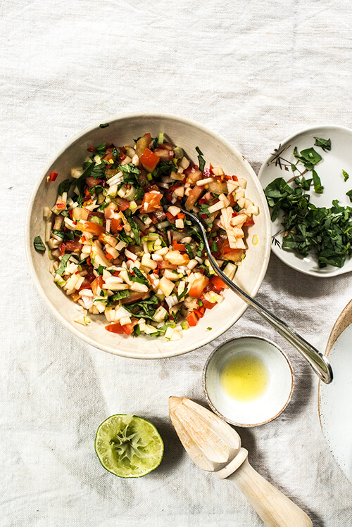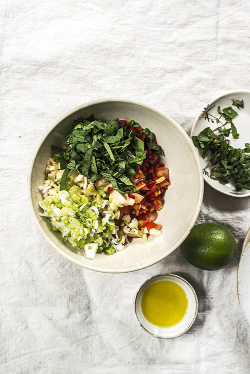If you haven’t done so yet, finely chop the apple, tomatoes, chilli pepper, spring onions and basil.