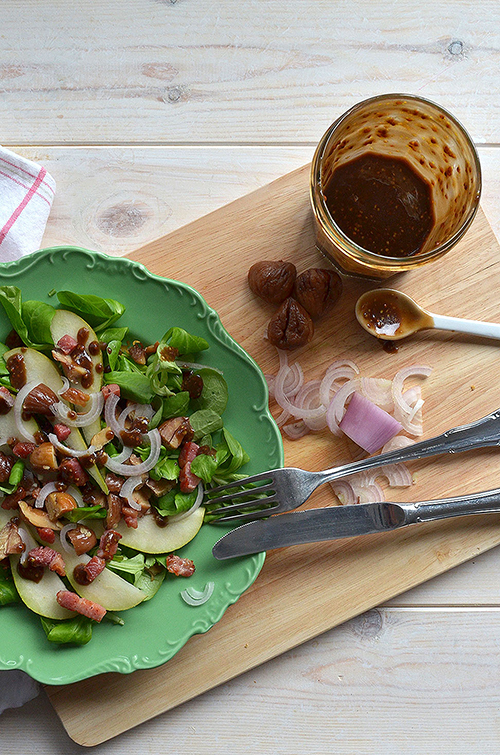 Serve your pears, shallots and chestnuts and pancetta on top of a bed of lamb lettuce and drizzle your dressing on top.