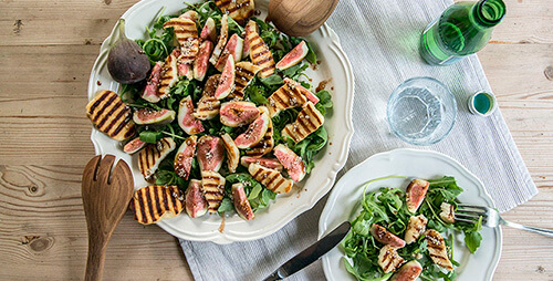 Put the rocket onto a large platter. Arrange the figs and grilled halloumi slices. Drizzle the vinaigrette over the salad and serve.