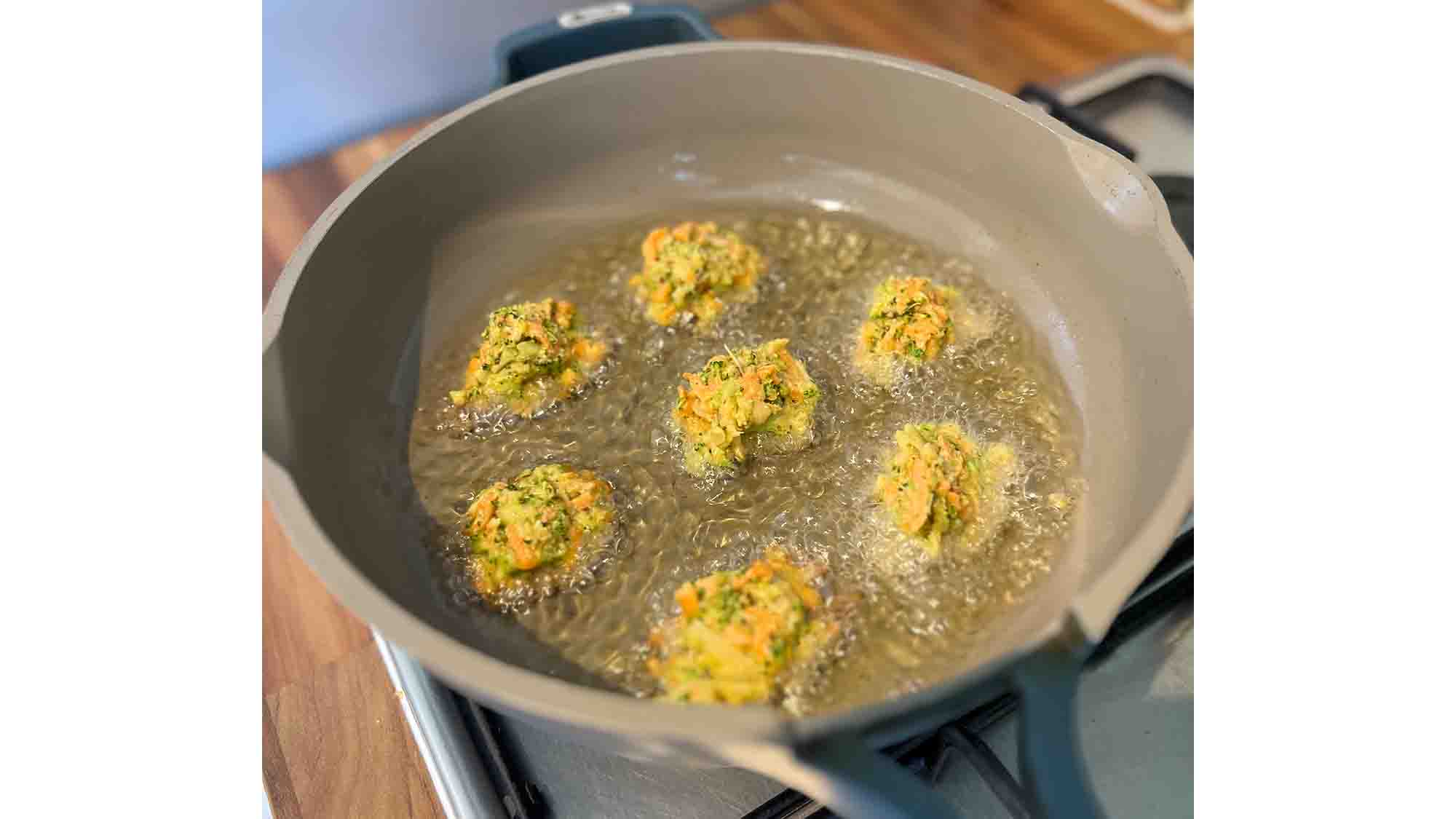 Heat some vegetable oil to about 1cm depth in a non-stick frying pan. Keep the flame at a medium heat. Gently place spoonful’s of the pakora mixture into the hot oil. When one side is completely golden brown (around 2 minutes), turn to the other side, pressing gently to flatten slightly.