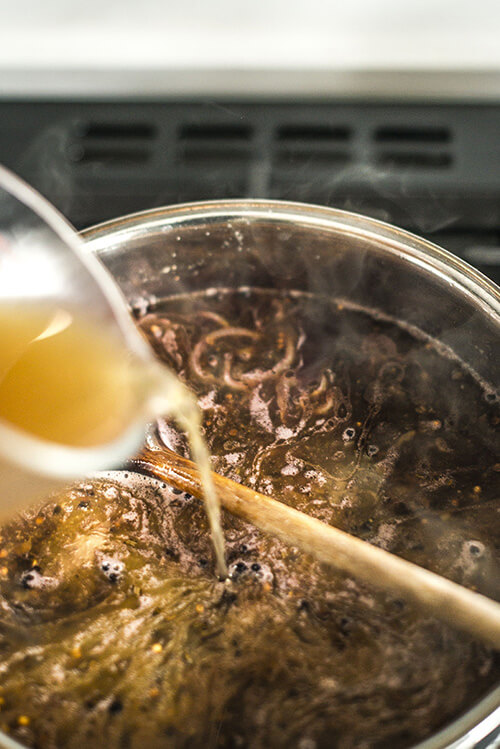 Add chicken stock. Bring to a boil. Lower the heat and reduce by half.