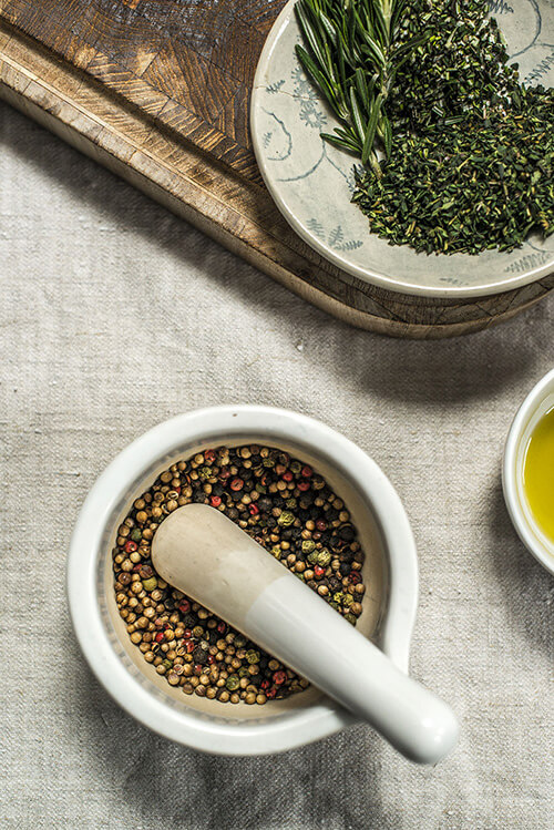 Coarsely crush peppercorns in a mortar. Stir together crushed pepper, salt, thyme and rosemary in a small bowl.