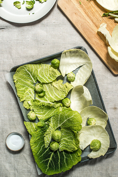 Cut the leaves of the sprouts from their stalks. Place all cabbage leaves on a baking sheet with parchment paper and sprinkle with salt flakes. Place in the oven at 160°C for about 10 minutes.