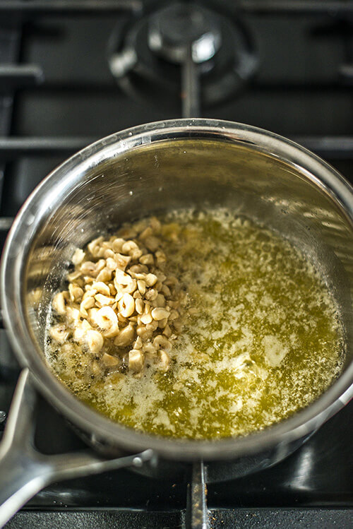 Melt the butter in a saucepan. When it starts to bubble, pour in the hazelnuts. Wait until it starts to smell like caramel and develops that great sweet taste.