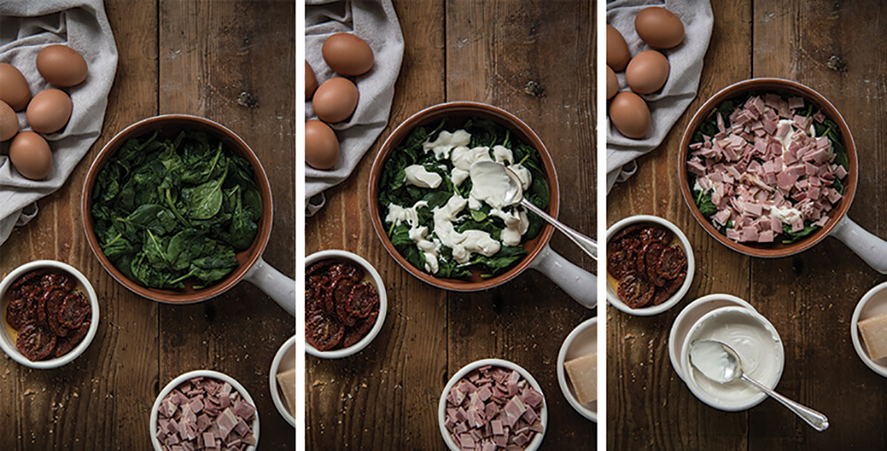 Now put the spinach into an oven proof dish, put the crème fraîche in dollops on top and sprinkle with the ham bits.
