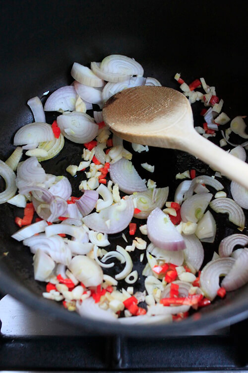 For the curry, heat the oil in a large pan (preferably non-stick). Add the garlic, shallots and chilli, and cook over a medium heat until starting to colour.