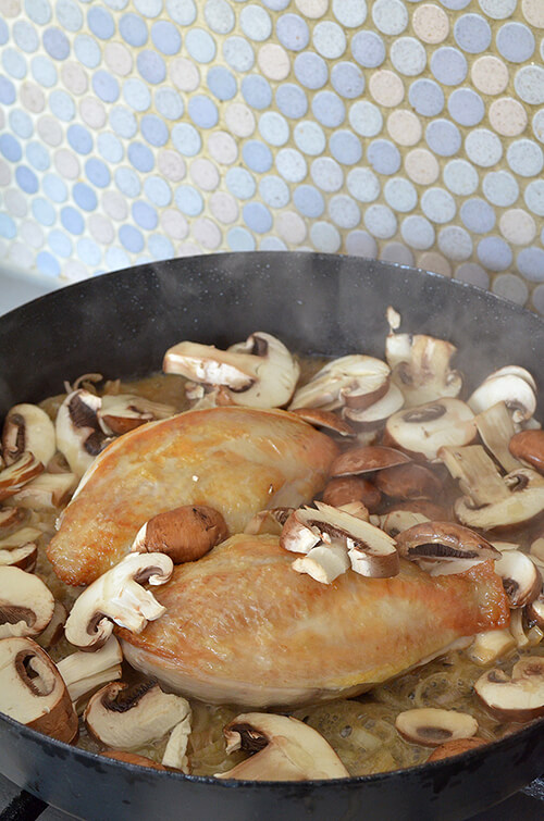Add the sliced mushrooms, stir and cook in the remaining wine until slightly soft.