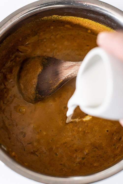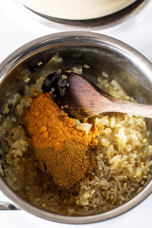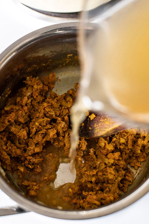 Now add the curry powder, turmeric and vinegar and stir until all combined