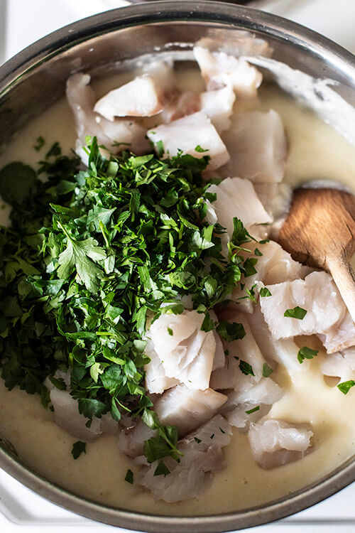 Add the fish chunks and chopped parsley to the sauce, season and stir