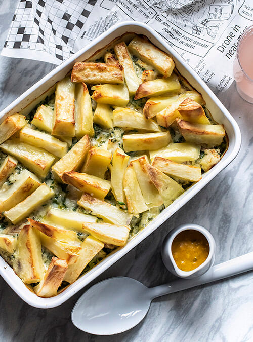 Made using traditional chippy cod, chips (or sliced potatoes for layers), mushy peas and chip shop curry sauce, the dish can be enjoyed encased in pastry for a tasty delight.