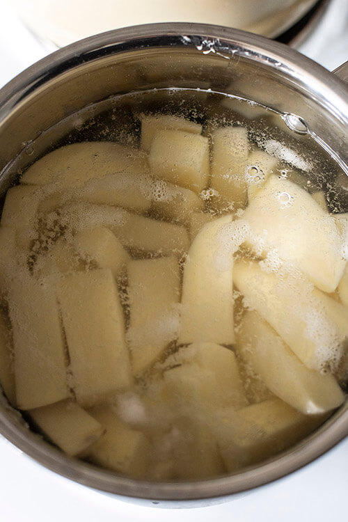 Boil the potatoes for 3 minutes, then drain and put aside