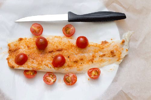 Lay each fillet of fish on a separate piece of greaseproof paper. Spread the garlic puree over the fish, followed by the sundried tomato puree. I find using my hands is the easiest way to do this.