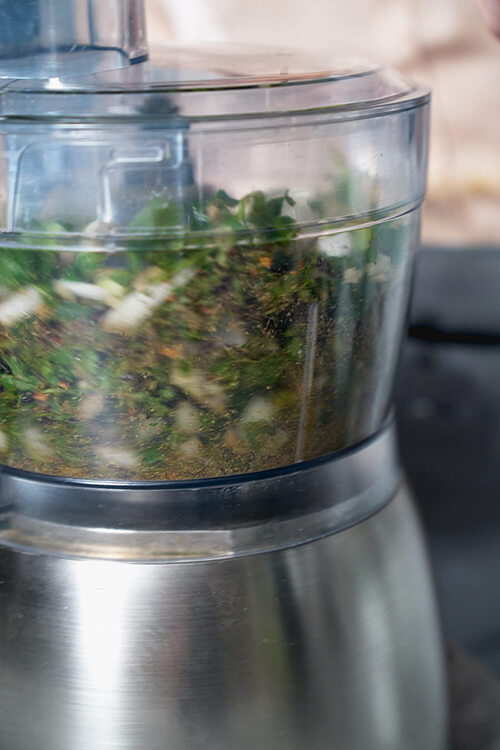 First, add your ingredients into the food processor: Onion, garlic, parsley, coriander, spring onions, chilli flakes, salt and cumin. Then, pulse 2-3 times. Add one can of chickpeas (that have already been rinsed & drained). Pulse 2-3 times again, then give it a good stir with a spatula.