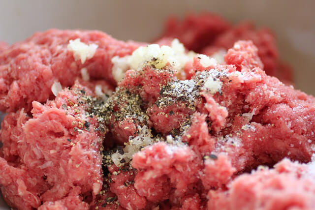 Mix the mince and seasoning in a large bowl. Make sure you really mix it well with your hands. Supermarket meat usually comes in ribbons that’ll fall apart when you start cooking so take some time to really mush it up with your hands.