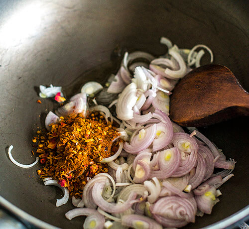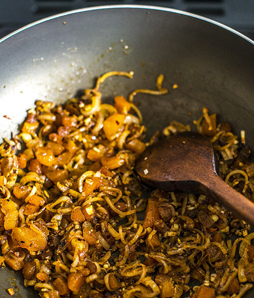 Put the olive oil, chopped shallots and ras el hanout into a large pan and sauté on a medium heat until the onions are soft.