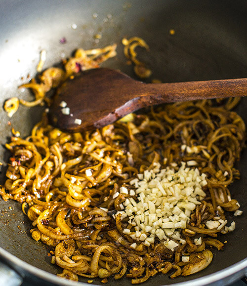 Add the garlic and stir – do not let it burn as it will turn bitter.