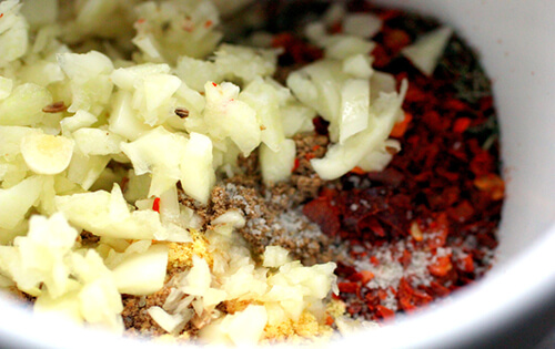 Mix your spices and chopped garlic together in a bowl and coat the pork once it’s been browned. I added half a cup of water and the three tomatoes to the tray before covering and sealing in foil.