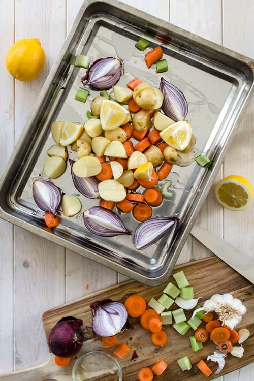 Chop the vegetables and one of the lemons. I don't bother peeling them, just give them a quick wash.