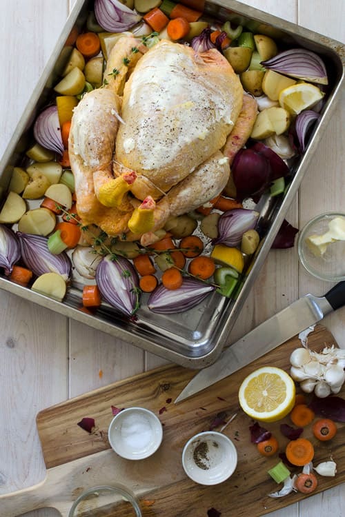 Imagine a sunny, but still cold Sunday with family and friends. What would your choice of food be for that day? Soup? Too "mid-winter". Salad? Still too cold for that. How about an easy to prepare, tasty and filling roast chicken full of flavour? That's the kind of food that is perfect for this time of the year. Not too heavy and wintery (we've been eating stews and pies since October last year), not so light that it will literally leave you cold and hankering after that warm pudding. My mum used to make this dish which I didn't actually like too much as a child. Back then, the lemon just seemed like a strange combination with the chicken. How times change, now I love it! Another great thing is that this is one of those dishes that are easy to prepare which means you don't have to spend half of your Sunday in the kitchen. Piling everything into one dish means less washing up, less messing about with various tins in the oven and therefore more fun and easier cooking. Perfect, don't you think?