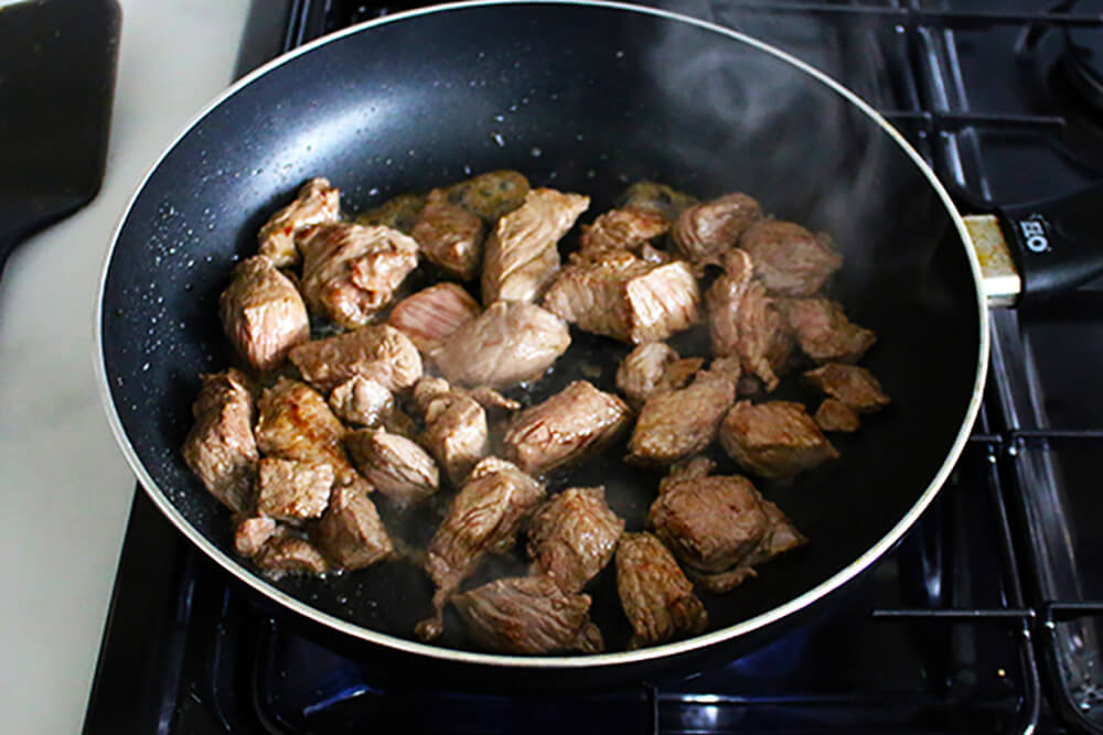 On the hob, with medium heat, heat your oil and then add the beef. Once fully browned, remove the beef with a slotted spoon and set aside.