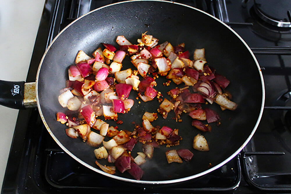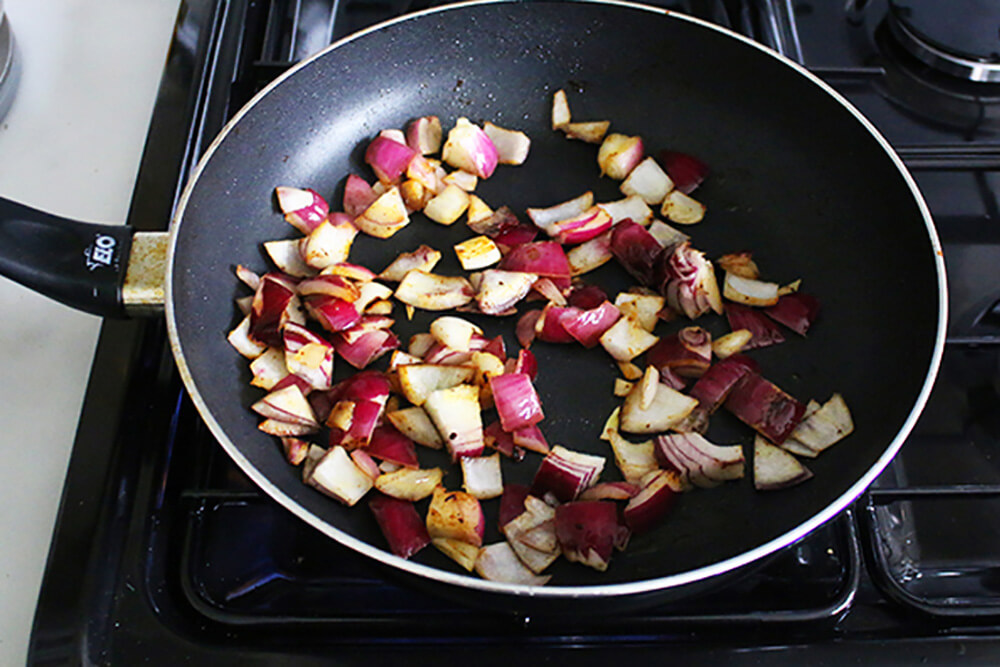 Using the leftover oil and juices, lower the heat slightly and add onions, stirring frequently until they start to soften, about 2 minutes.