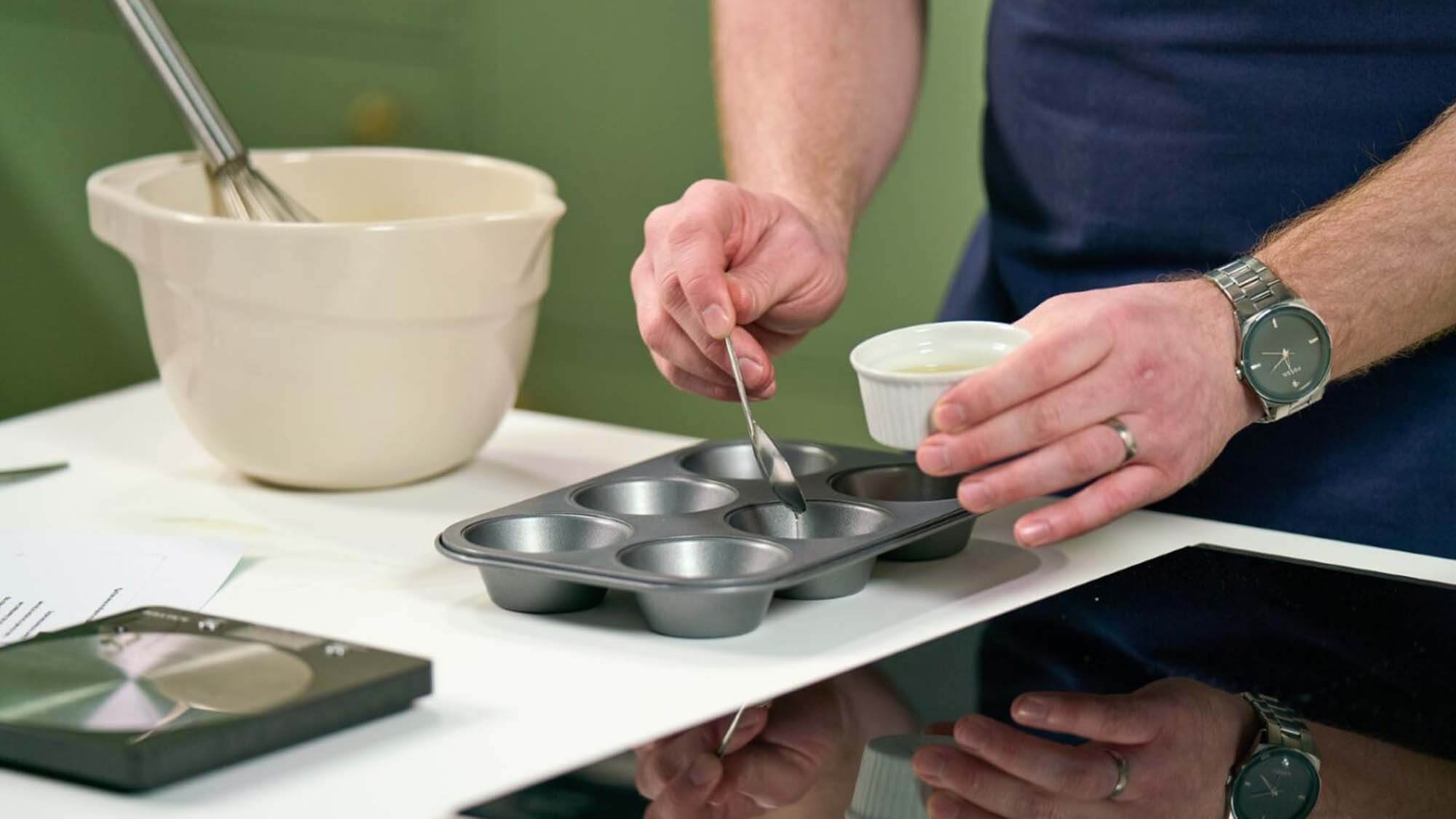 Add a tiny drop of veg oil to each hole in a muffin tin.