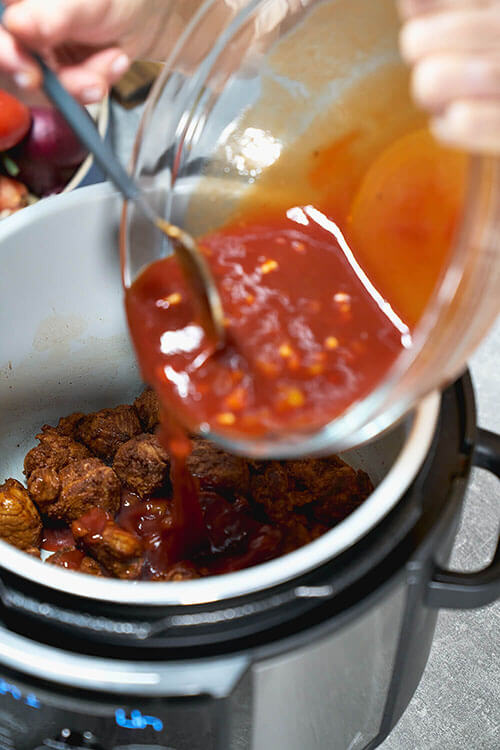 Then, when every piece of pork is in the pan, add the prepared sauce. Give it a good sir making sure you’ve got full coverage and set the cooker to the Meat/Stew setting. Cook for 90 minutes.