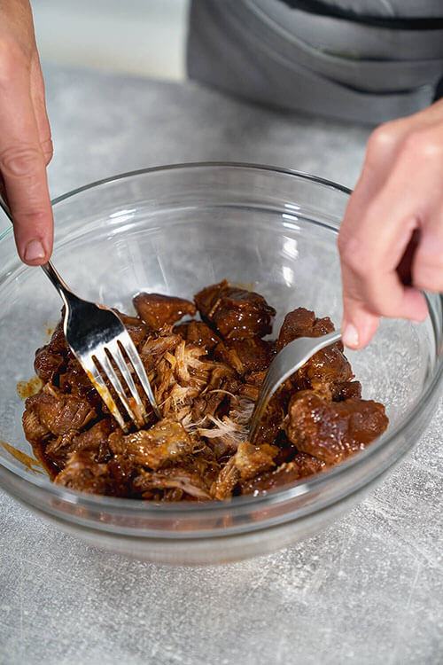 Next, shred the pork pieces altogether in a bowl. Add a little more of that gorgeous sauce. Serve on fluffy wholemeal bread rolls and pass around for those satisfying first bites!