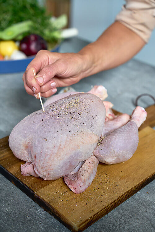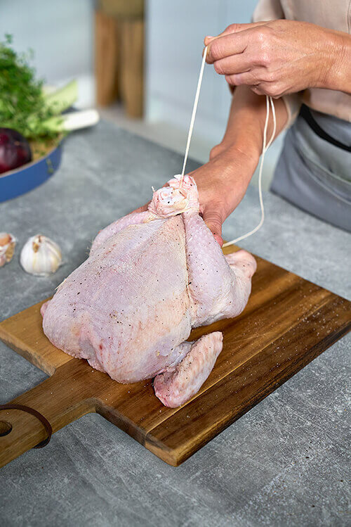 Take 3ft of cotton cooking twine, loop around the legs & pull together. Take each end and piece around each leg, at same time. Pull each side of string to the top of the bird. Next, flip the bird over, pull twine under the wings and loop around the neck and tie-together. Cut away any excess twine. Then, flip the bird back over and tuck wings underneath the body.