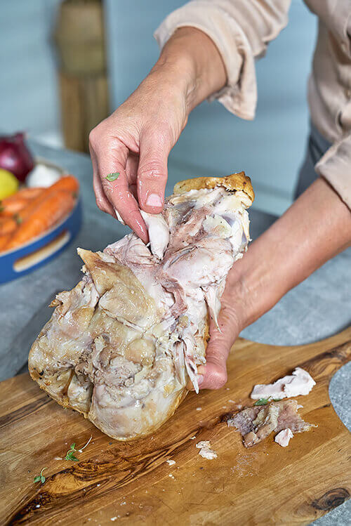 Remove all the twine, clip the legs, carve from leg to breast, and check for clear juices. When you reach the joint, bend back and cut right through. Twist the wings off with your hands. Next, cut down the tail bone in the middle to remove the breast and cut as close to the bone as you can.