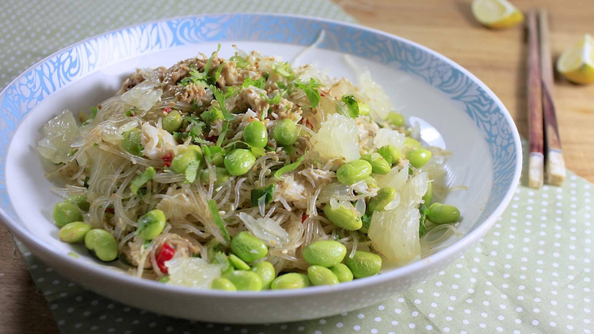 Heat the oil in a large non-stick frying pan and add the garlic. Cook over a medium heat until it just turns golden, then turn off the heat. Add the noodles to the pan with the dressing, chilli, spring onions, coriander, pomelo\grapefruit, edamame beans and crab meat. Toss well to combine everything, then turn the heat on again just to warm everything through gently.