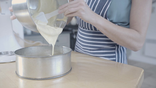 Add the sieved flour and the vanilla essence and once thoroughly mixed, divide the mixture between the four tins.