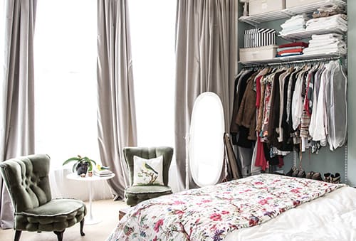 We love it though. It's nice to have your clothes visible, as I find I forget to wear things that are hidden away all the time (also it's easier to take them to the charity shop if they're there, unworn, for year after year). I also feel that the open wardrobe brings a little bit of a relaxed feel into the room, which has high enough ceilings to absorb the look without it seeming messy.