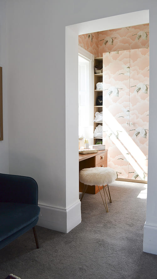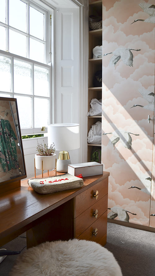 Lisa’s wardrobe didn’t escape the renovation: “I also wallpapered my dressing room, including the wardrobe doors. This was a risk but I was so pleased I did it – it’s now a room decorated with cranes flying through pink clouds and I really love it.”