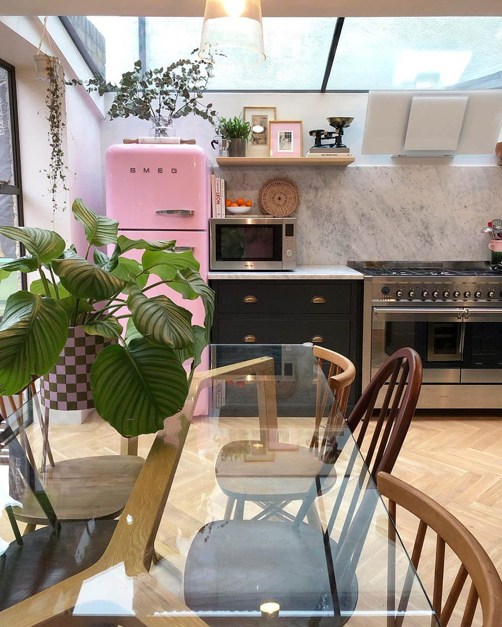 With a big range and a big hood, space may be at a premium. We know the cooker is the star of the show, but you need room for your pans and food to cook on it! Make sure you plan carefully to use every inch of the space you have. There are lots of clever storage options available that use narrow spaces with pull out trays or clever use of corners. You may not need cupboards – open shelves look great. Plus pans look really cool hung up on an industrial-style ceiling rack. Mugs can be hung by their handles on hooks under shelves. Use risers in cupboards to use every inch of your vertical space. Don’t forget to declutter too so you’re not storing things you don’t need.