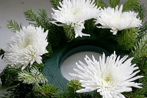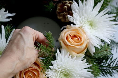 Once you are satisfied that the base is about 70% covered, cut the stems of your chrysanthemums to about 1-2” long and insert them at various spots around the wreath. Do the same with the roses followed by the hypericum.