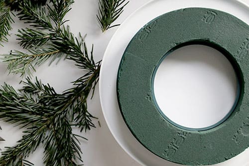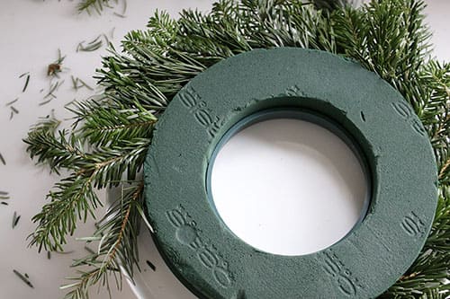 Start inserting the stems into the wreath starting from the edge of the wreath. You want to insert each stem at a 45-degree angle to the wreath so that as you insert them, they begin to wrap and cover the base of the wreath.