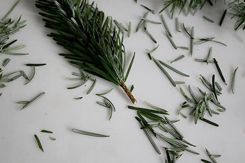 Begin by cutting small pieces from your pine branches so that each stem is between 3-6” long.
