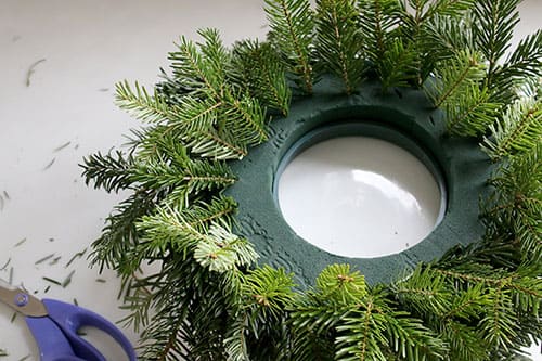 Then begin using the pine stems to fill in the top of the wreath. Keep them relatively short and again, angle them slightly so they are facing away from the middle of the wreath.