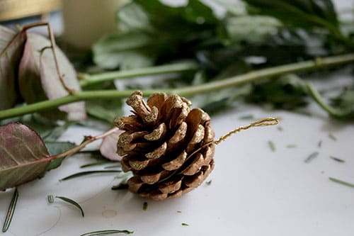 For the pinecones, wrap a long piece of wire to the bottom of the stem and twist to form a spike. Use the spike to secure the pinecone to the foam.