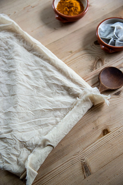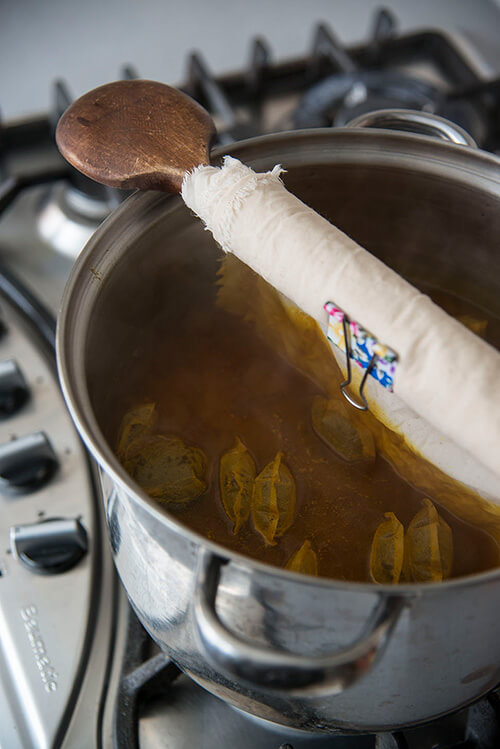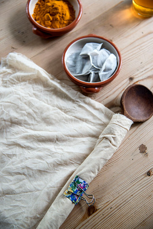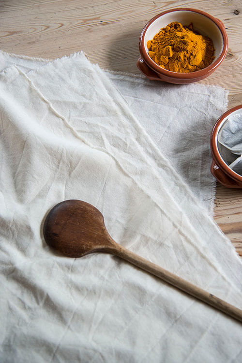 Add the turmeric and stir. Now put the wooden spoon on top of your pot and suspend the fabric into the water. The fabric will immediately take on the colour and slowly travel upwards. Leave like this for an hour on a low heat.