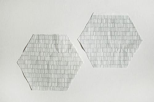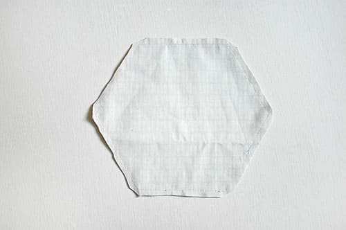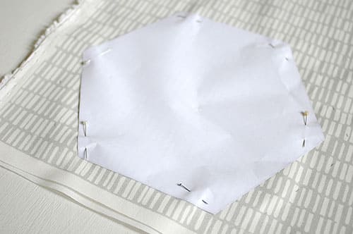 Pin the paper template to your fabric. I folded the fabric in half so I was able to cut out two hexagons at a time. This makes the front and back of your placemat. Measure an extra 1.5-2cm around the entire template and mark with a pencil.