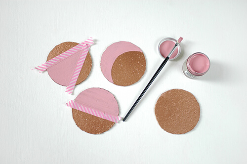 Paint on your designs using the pink paint. You can either do them all the same or different. Use masking tape to get straight lines, or draw around a circular object if you’d like curved lines. You will probably need at least two coats of this paint.