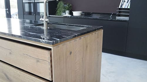 Her look is full of classics: wood, granite and plain black, but beautifully made kitchen cabinets. “I could never get bored of this look and keeping it to a neutral colour palette means I can accessorise with other items on and around the kitchen.”