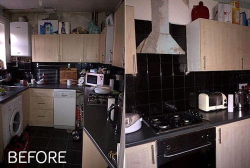 The black tiles, floors and worktop sucked any light out of the room. The kitchen units were cheap, the cooker hood didn’t work and the lowered false ceiling not only made the room feel smaller, it was made of UPVC which hid a botched electric lighting job. The boiler was broken, there was a maze of pipes running all over the walls and the wood had been neglected. “We referred to it as the hovel,” Karen says. “I officially hated it.”