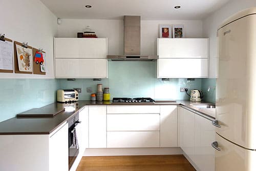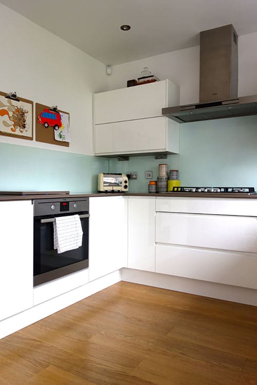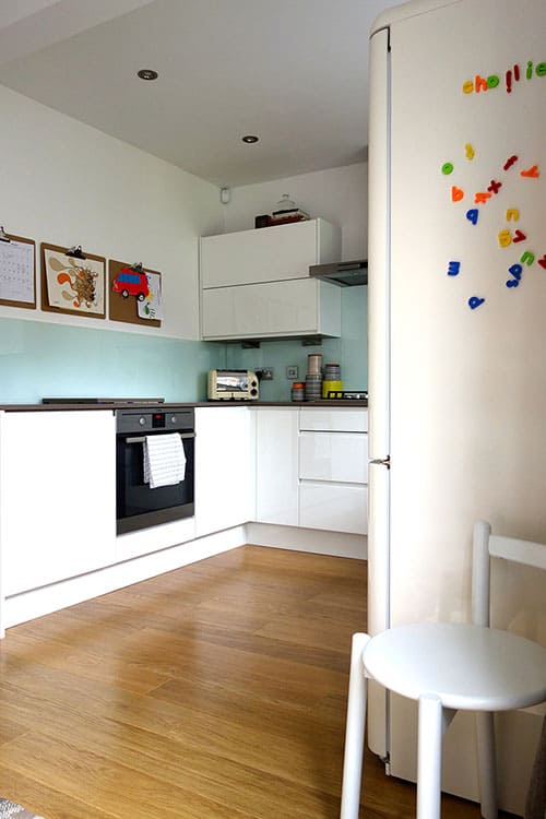 As for the design, Karen opted for white gloss handleless units to make the most of the north-east facing room. The look is unfussy and clean, perfect for a smaller space.