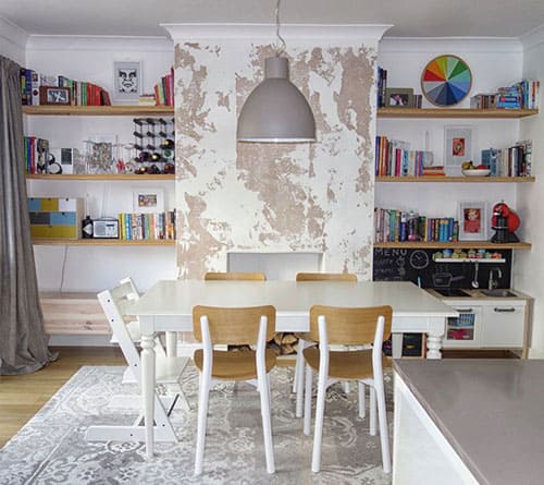 Opening the kitchen to the dining room meant the open storage would also be put to good use “We utilised the shelving in the dining area to house things like wine glasses, spirit bottles, cookbooks and our coffee maker.” Using the space as one connected each area fluidly and made use of the entire open plan.