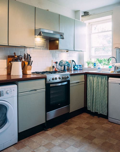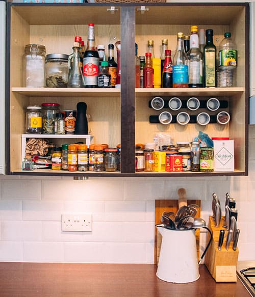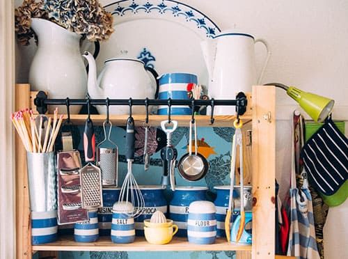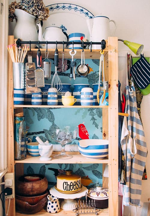 Finally, if you’re short on cupboard space, think about adding removable extra storage. Free standing shelving, pot racks on walls or suspended from the ceiling – cram that stuff in.