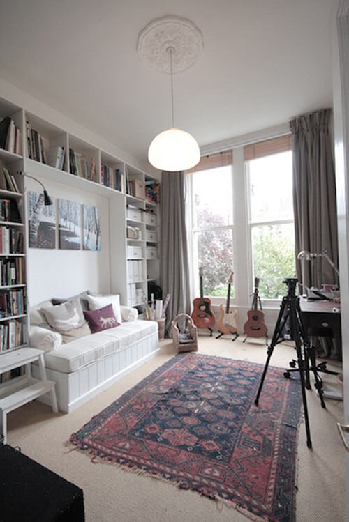 Good rugs may not always be cheap (though bargains can be had in antique shops), but they are a good investment, as they are all yours and can go with you when you leave. Yes hardwood and tiles would be more elegant, but let’s face it, they’re antisocially noisy if you have downstairs neighbours. Also carpets and vinyl make this a flat very cheap to heat!
